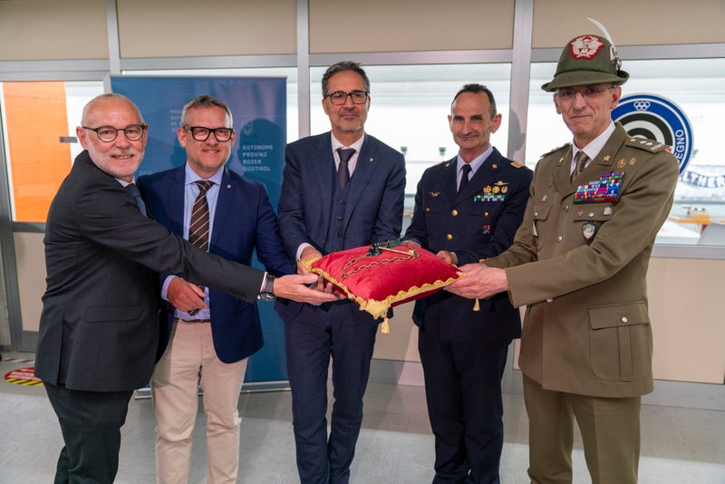 - La consegna simbolica della chiave del poligono. Da sinistra: il presidente della Sezione Tiro a segno di Bolzano Marco Berton, l’assessore provinciale alle Opere pubbliche, Valorizzazione del patrimonio, Libro fondiario e Catasto, Christian Bianchi, il presidente della Provincia autonoma di Bolzano, Arno Kompatscher, il direttore generale di Geniodife, generale ispettore Mario Sciandra, e il comandante delle Truppe Alpine, generale di Divisione Michele Risi. (Foto USP/Daniel von Johnston) » [IMG 1 MB]